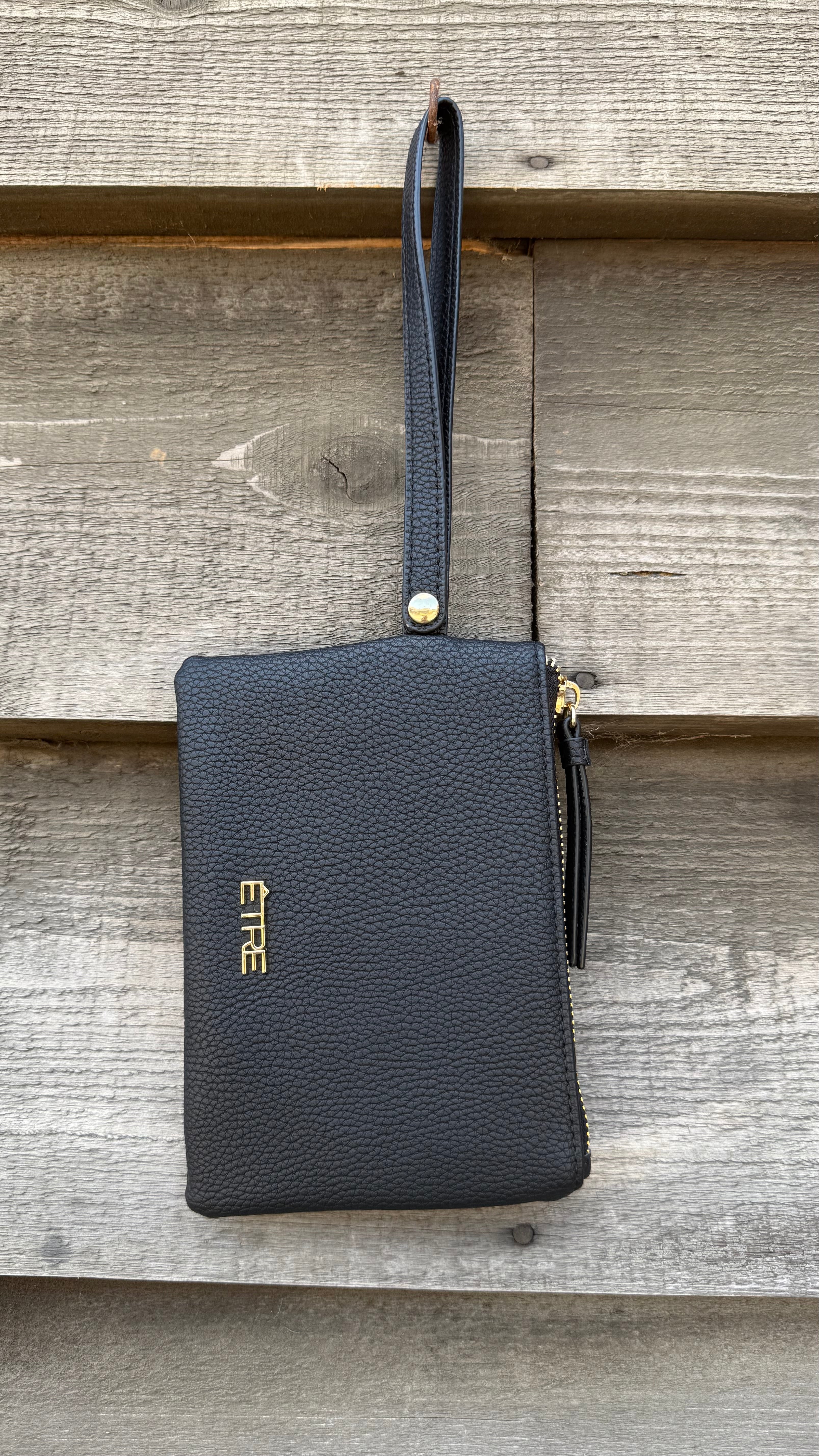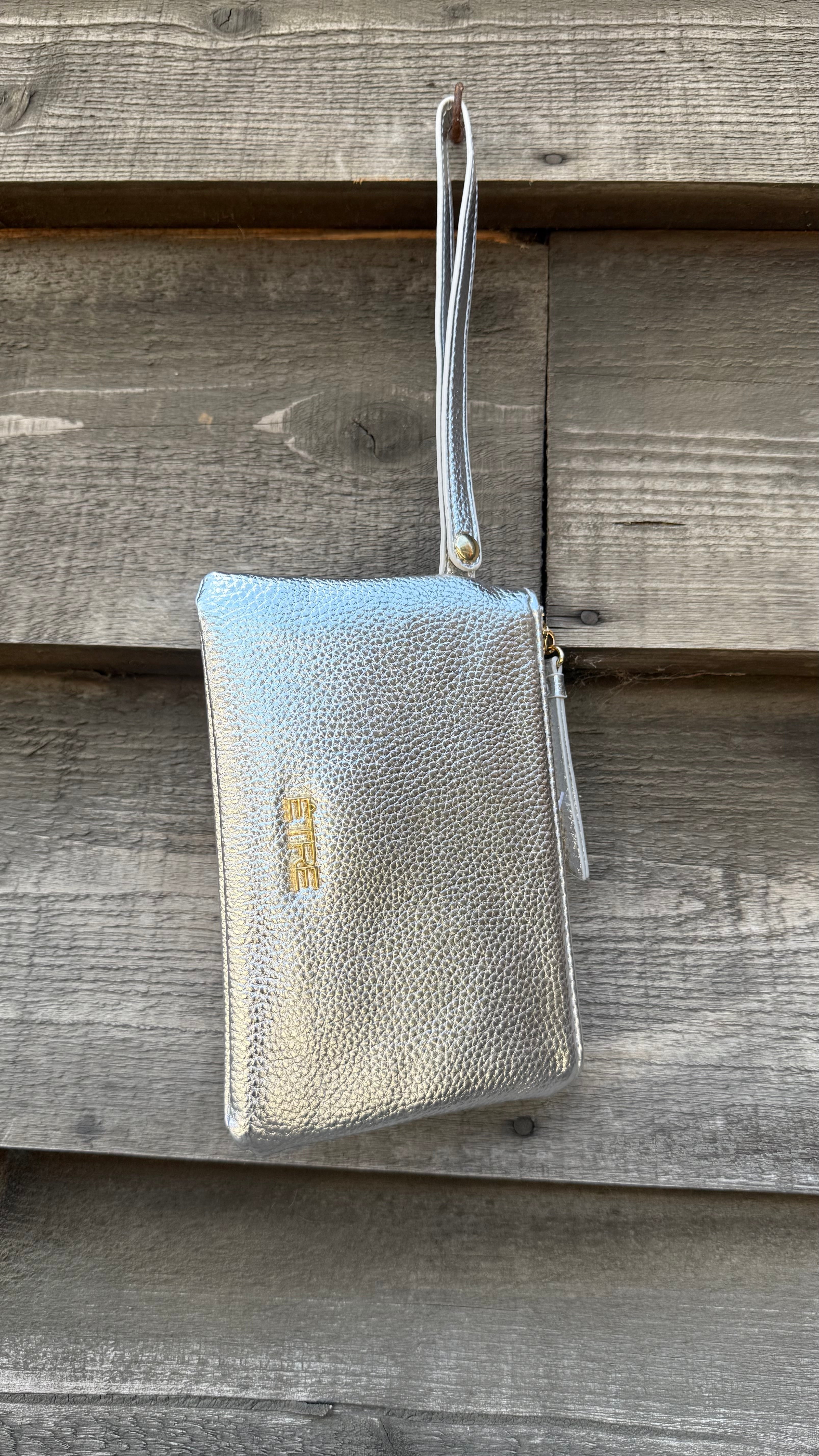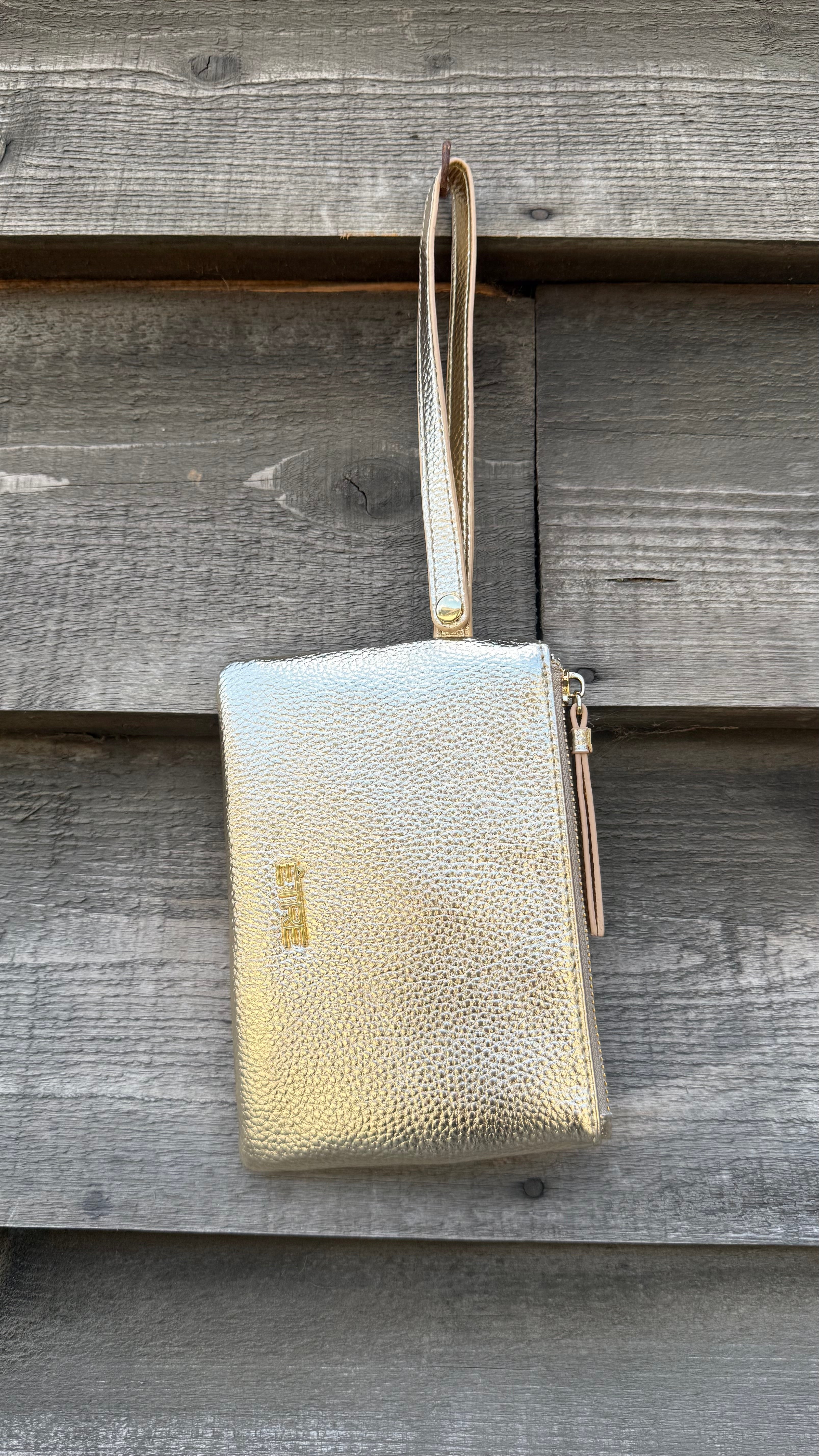 This contemporary metallic wristlet purse is crafted from soft polyester and designed to imitate cracked leather. Featuring a convenient wrist strap, zip closure and classic gold hardware.