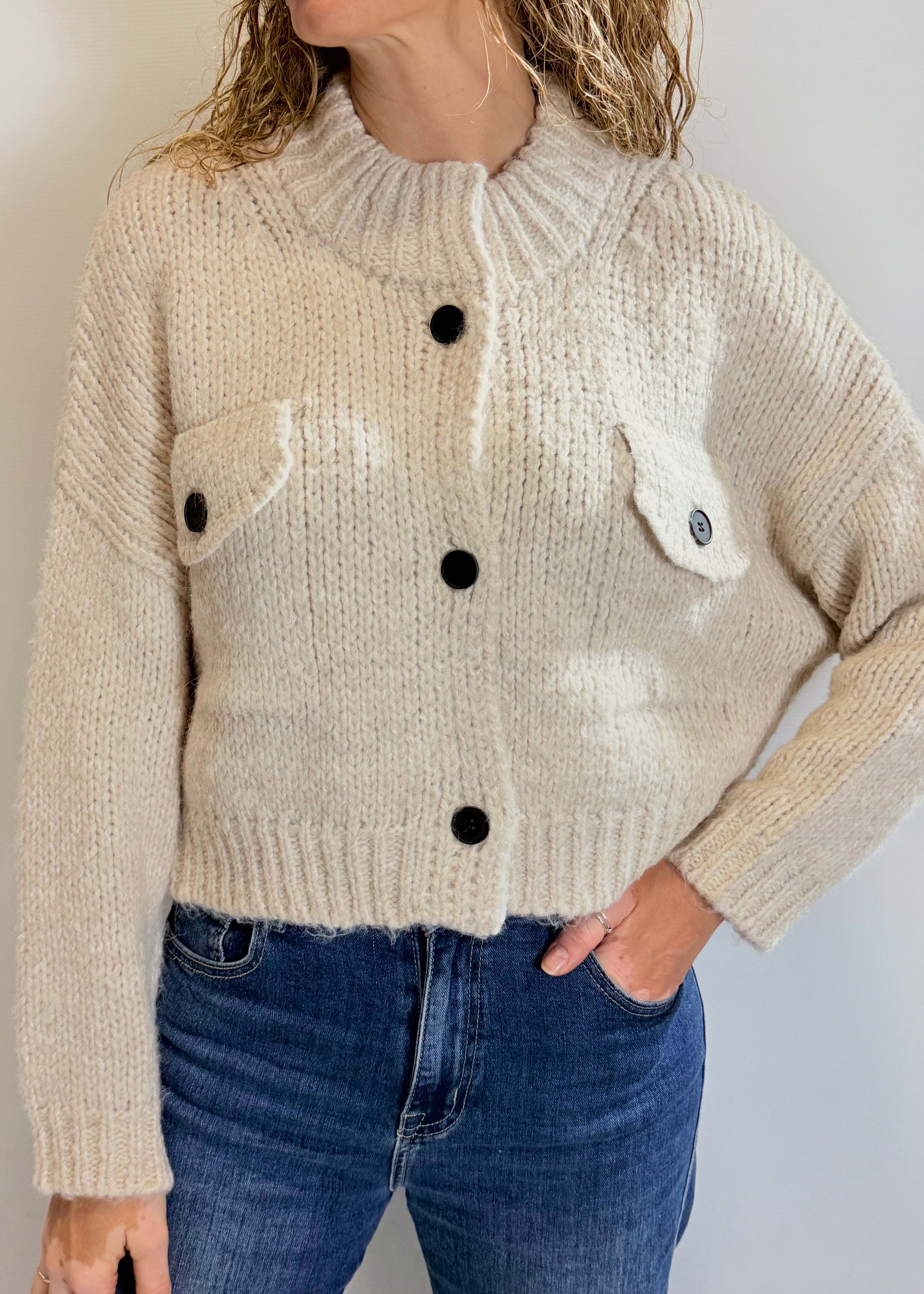 This thick cardigan features a cropped fit, providing warmth and comfort ideal for chilly winter days.