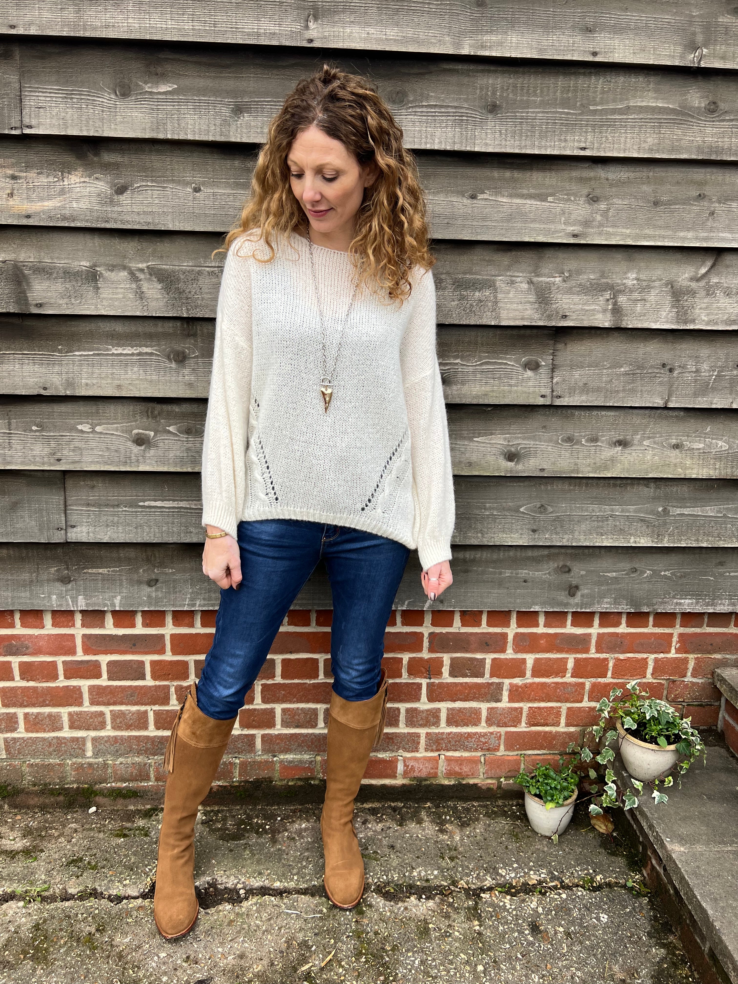This Elsie Jumper features a relaxed slouch neckline and a cozy knit design, with a subtly extended back length. Available in one size suitable up to UK 16.