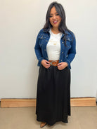 Black satin skirt with elasticated waist, looks great with our bestseller Rebecca Belt