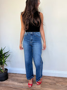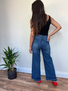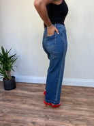 The Olivia jeans are a mid riser palazzo legs style with little gems details on the side.