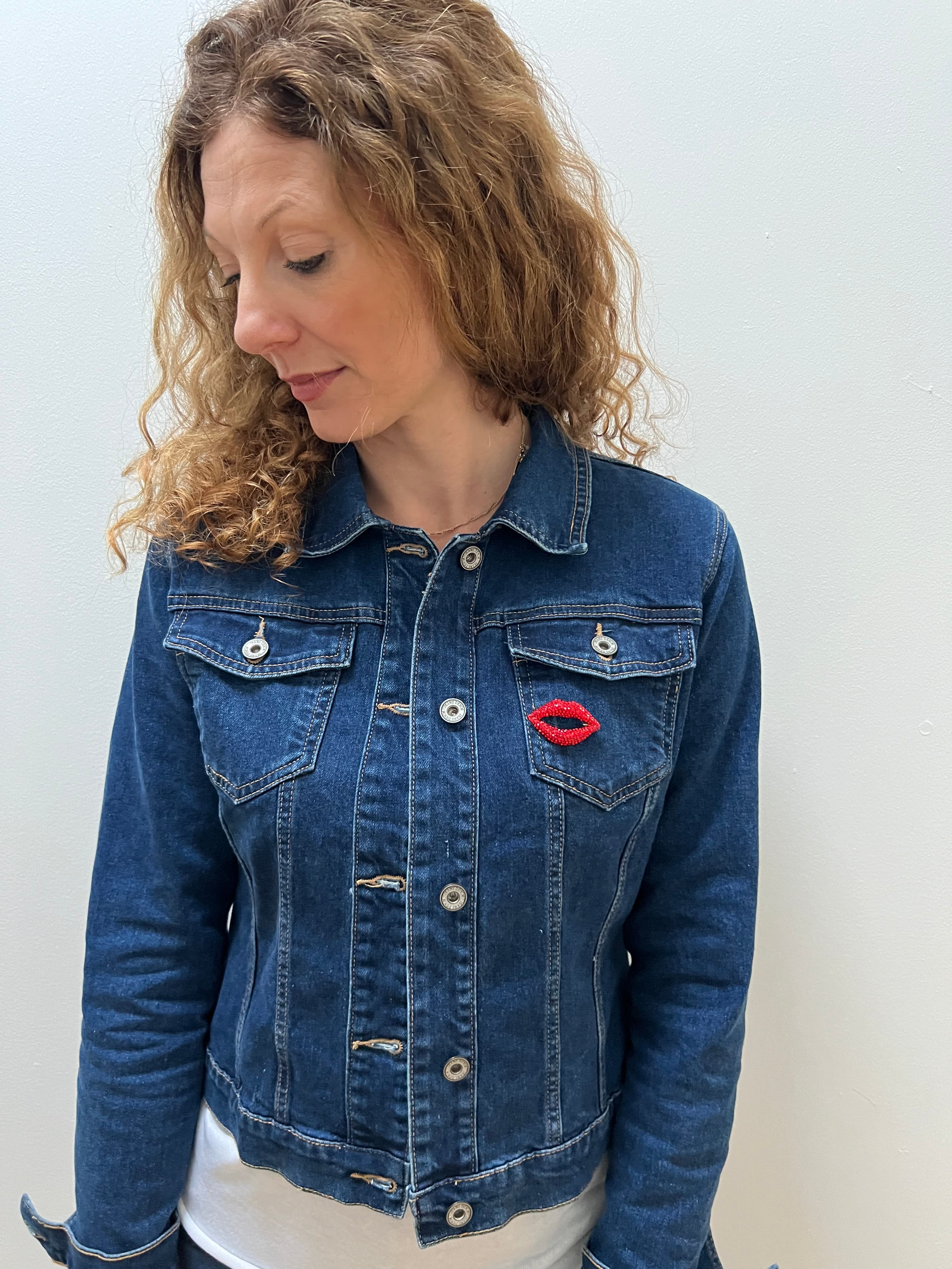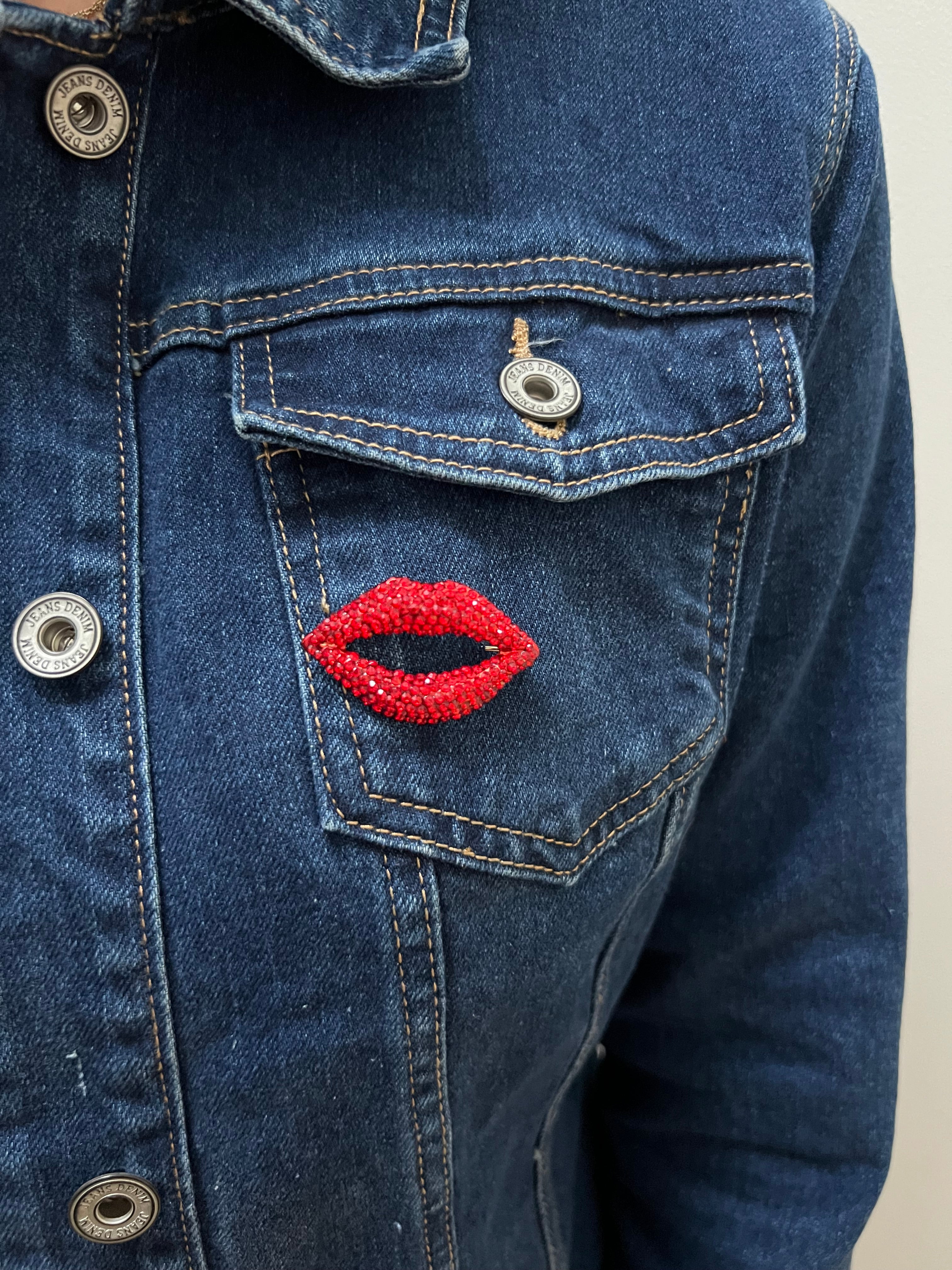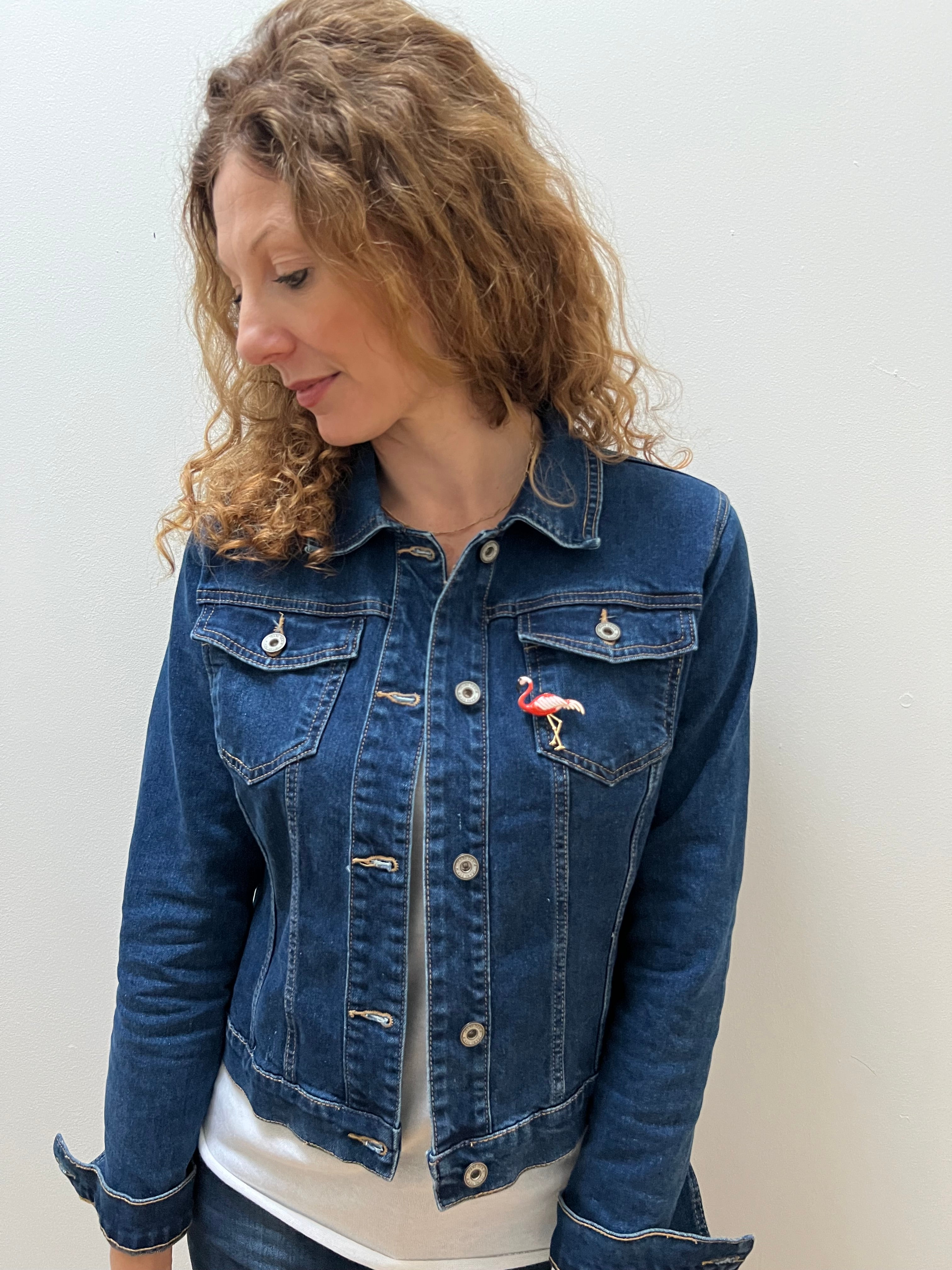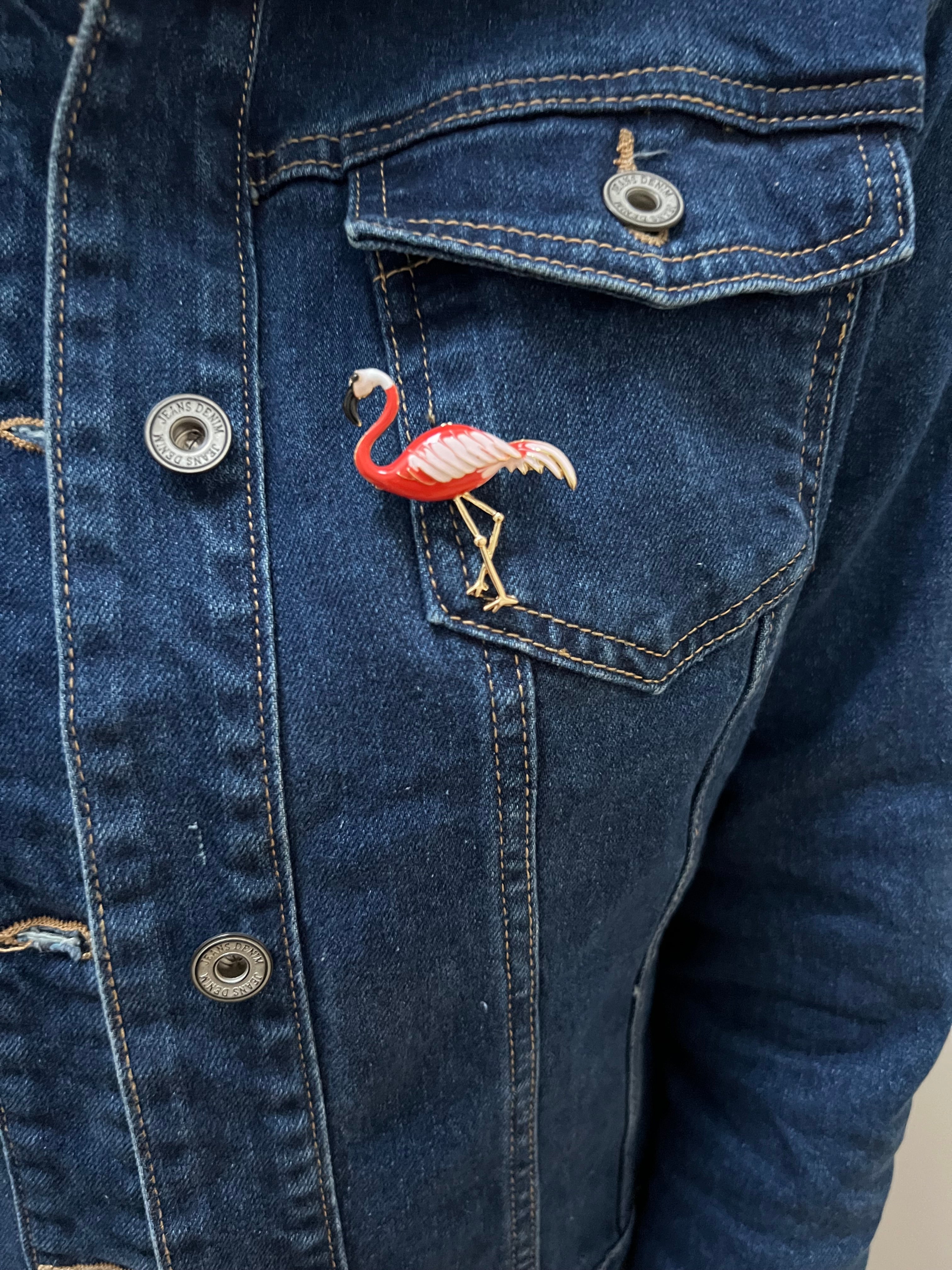 A person wearing a blue denim jacket with a sunflower brooch on the lapel.
