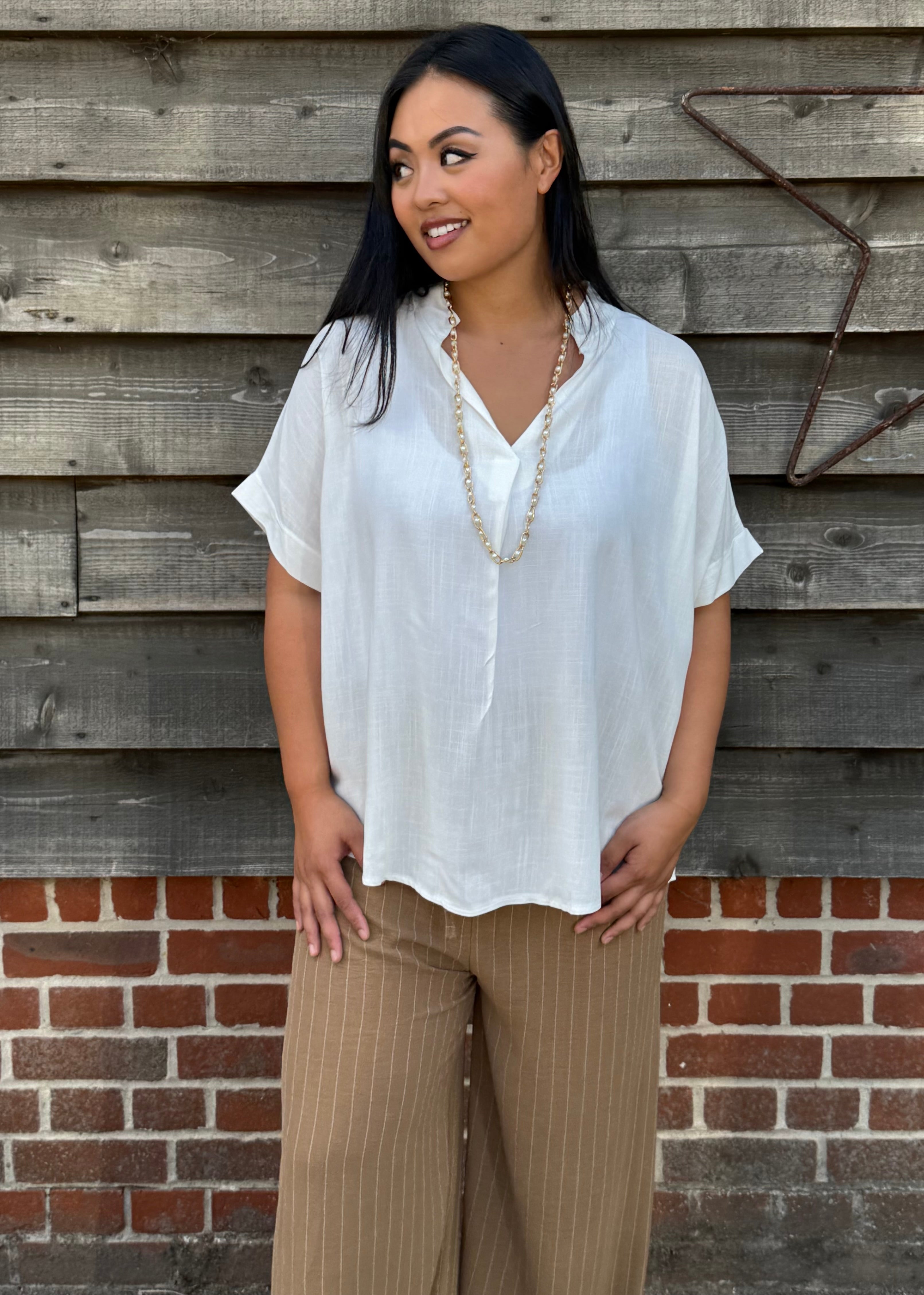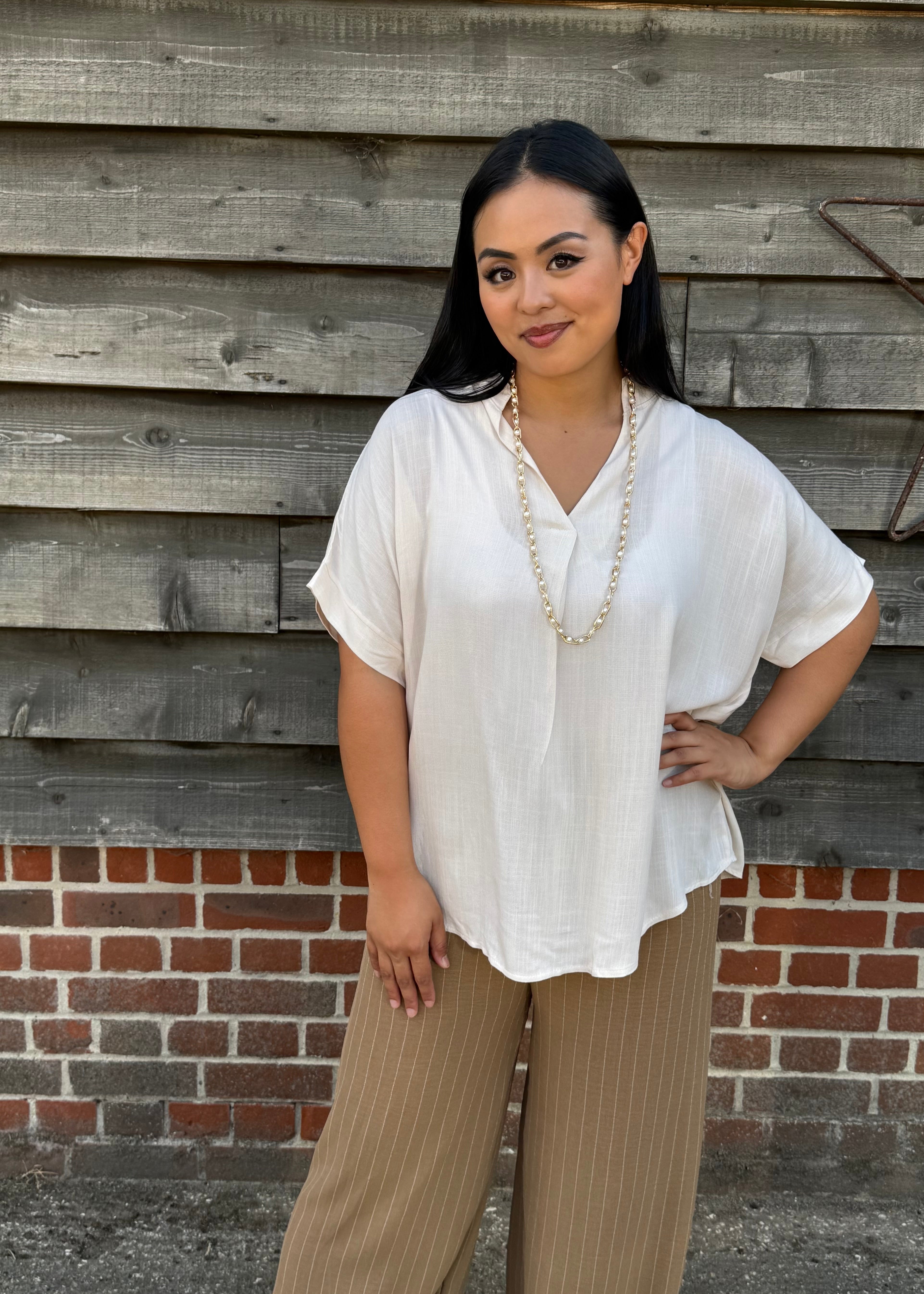 The loose fit allows for a relaxed and flowy look, while the v neck adds a touch of sophistication. Perfect for elevating any outfit effortlessly.