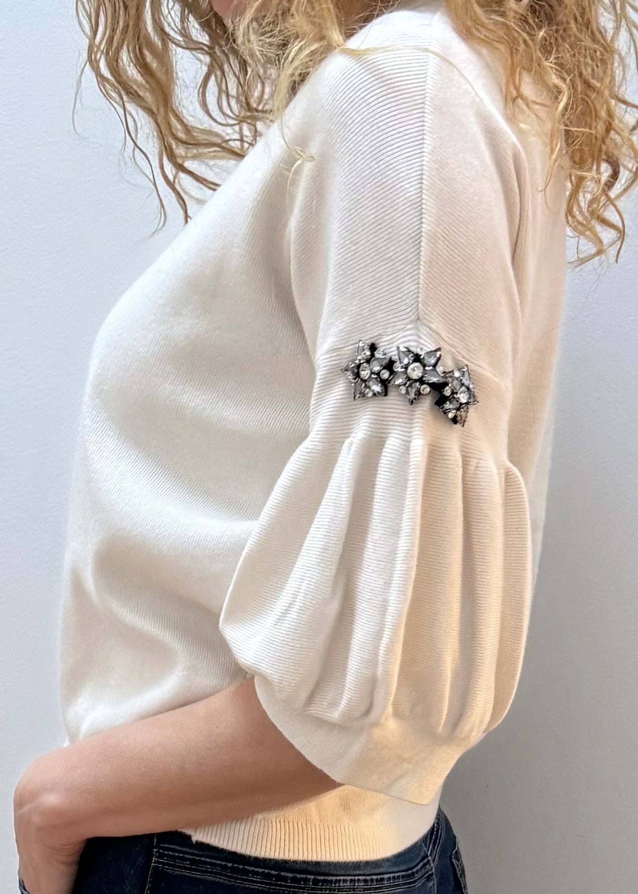 Upgrade your wardrobe with our Nicole Jumper. This elegant off white stylish top features unique arm details.