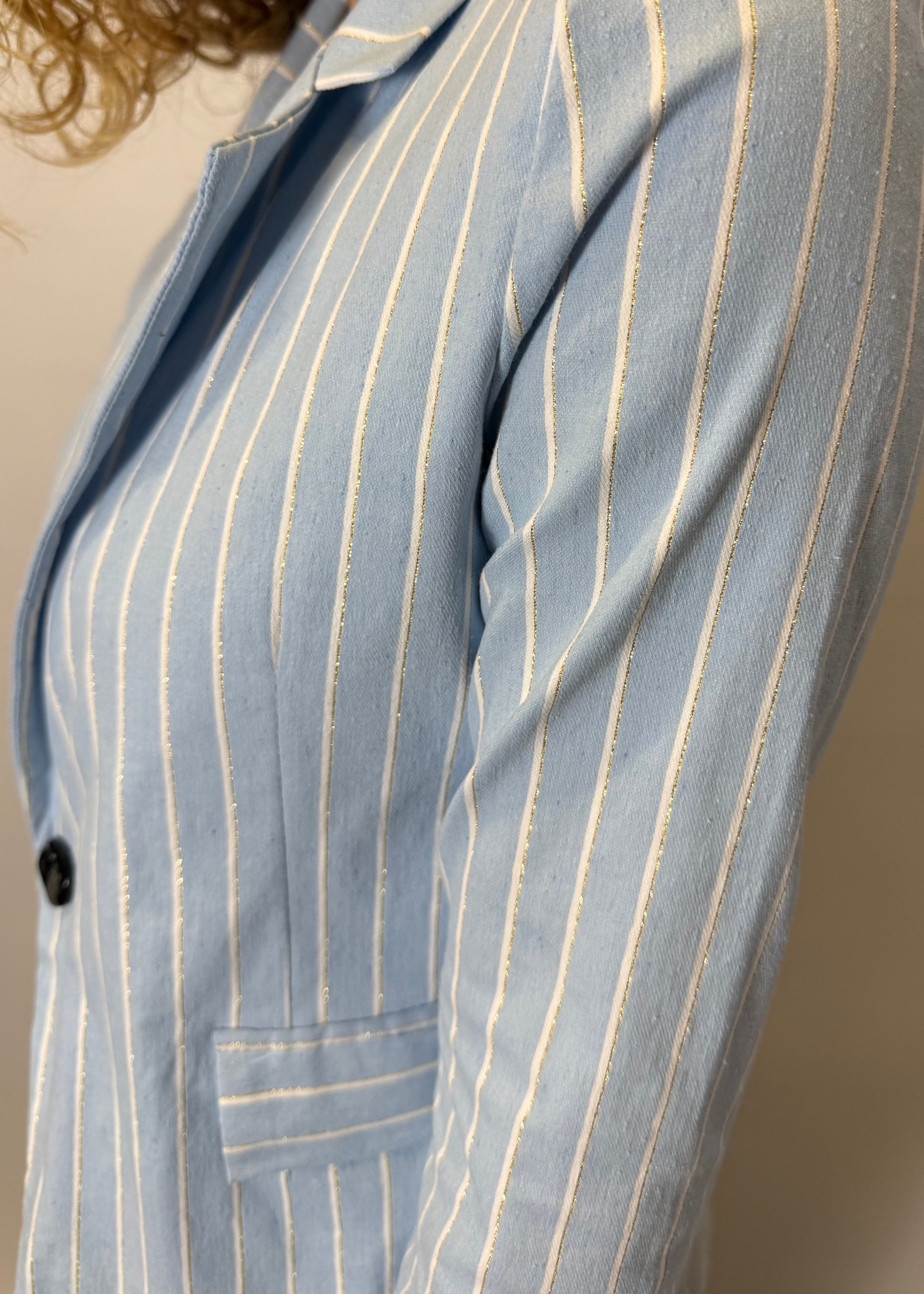 Crafted with a comfortable stretch fabric and adorned with elegant gold threads, it adds a touch of sophistication to any outfit. Perfect for both work and casual outings, this blazer combines style and comfort effortlessly.