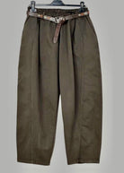 There cotton barrel legs trousers are trendy and comfortable. Perfect for a relaxed casual look. Includes the faux leather brown belt.
