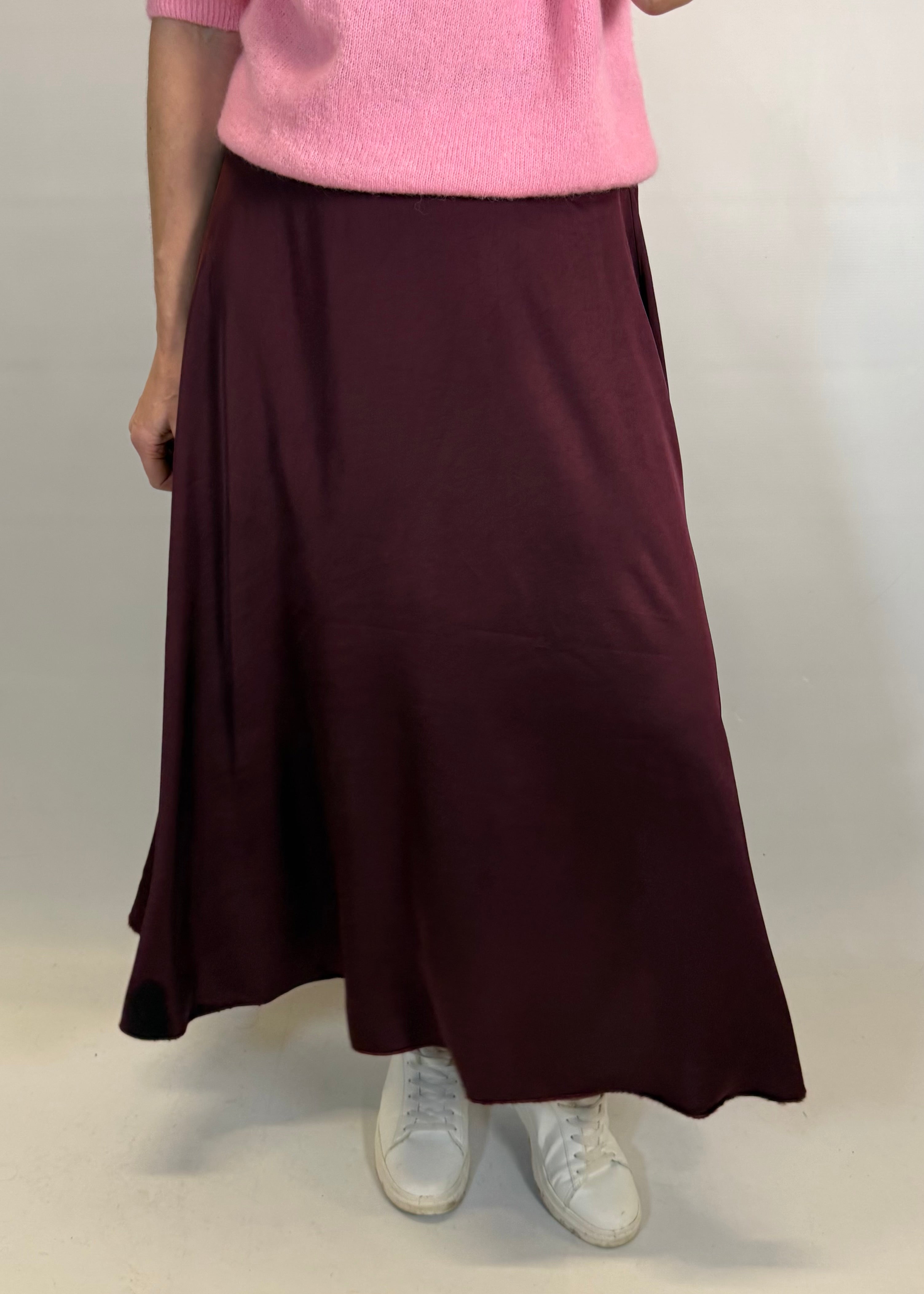 These gorgeous deep burgundy satin skirts are great for casual wear or with a blouse and heels for that special occasion.