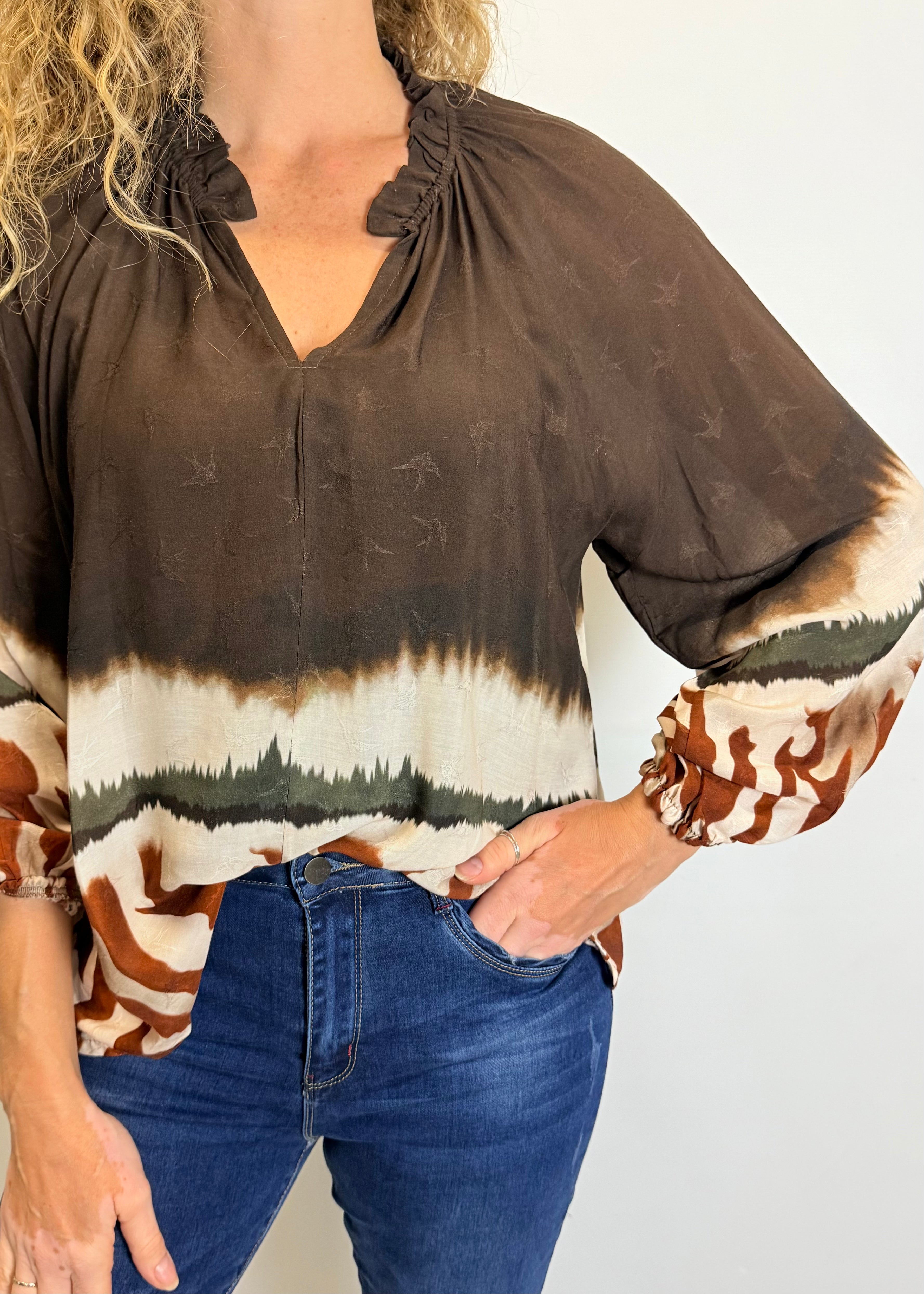 This blouse features distinctive balloon sleeves and a stylish two-tone design.