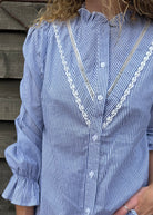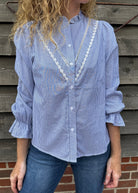 Featuring a ruffle collar, lace chevron stripes and long frilled sleeves, this blouse looks chic and feminine.